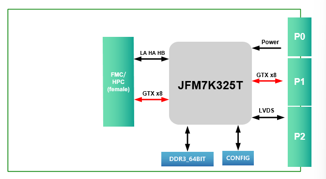 标准VPX 3U板卡, 基于JFM7K325T 芯片,pin_to_pin兼容FPGAXC7K410T-2FFG900 ,支持PCIeX8、64bit DDR3容量2GByte,HPC的FMC连接器,板卡支持各种接口输入,软件支持windows,Linux驱动。可应用于高性能计算,频域算法,如与FFT的加速等;配合AD,DA FMC子卡,实现高速数据采集,回放。