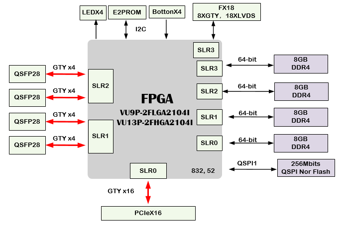 ● 主芯片使用XCVU9P-2FLGA2014I 工业级芯片。或者 XCVU13P-2FHGA2014I
